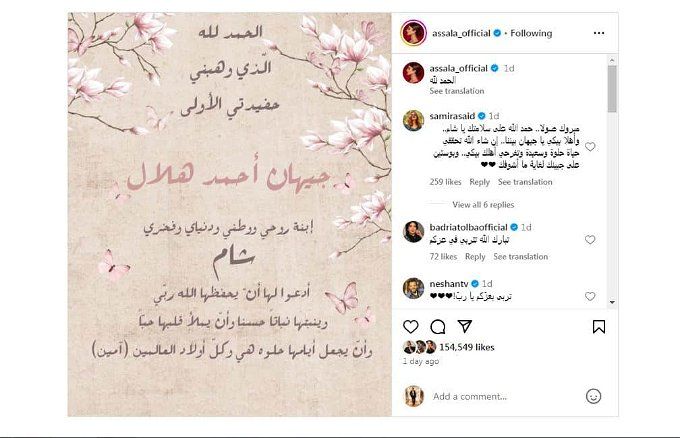 وتسبب هذا البوست في حالة من البهجة والسرور لدى الكثير من جمهور الفنانة أصالة نصري، وقاموا بتهنئتها بحفيدتها وتمنوا لها الصحة والعافية ودوام الحب والاستقرار في عائلتها.
