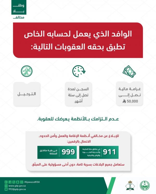 وتحرص الجوازات السعودية على تحذير الوافدين من الوقوع في هذه المخالفة حتى لا يتعرضوا للعقوبات النظامية، ودعت مديرية الجوازات السعودية عبر حسابها الرسمي على منصة إكس، للإبلاغ عن مخالفي أنظمة الإقامة والعمل وأمن الحدود من خلال الإتصال على الرقم 911 من مناطق مكة المكرمة والمدينة المنورة والرياض والشرقية، أو الإتصال على الرقم 999 من بقية مناطق المملكة.